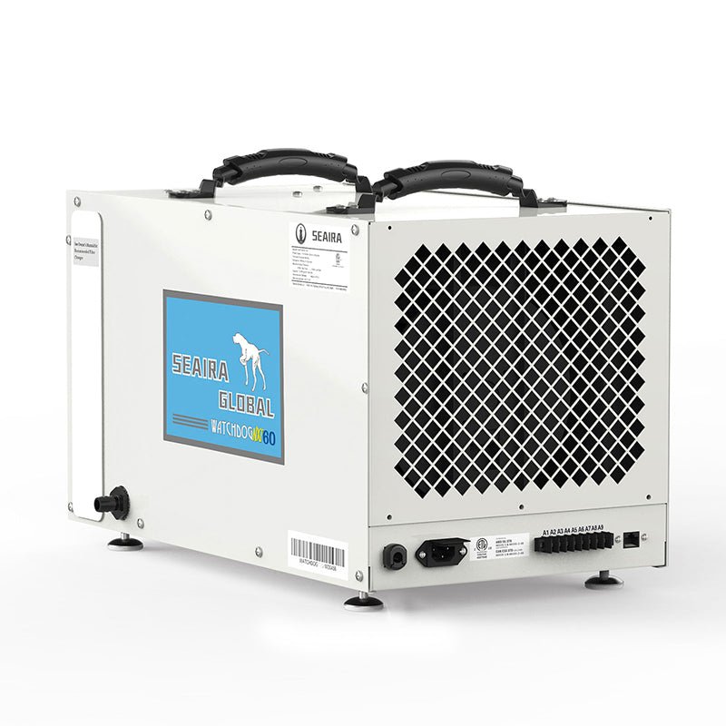 The Watchdog NXT60 dehumidifier provides exceptional moisture removal in basements, crawl spaces, attics, and other spaces that are hard to reach and require a portable option. Measuring only 12" high, the Watchdog NXT60 dehumidifier by Seaira Global fits just about anywhere that moisture is a problem. It effectively controls moisture in areas up to 11,000 cubic feet by removing up to 60 pints per day. Convenient carrying handles and lightweight design (only 56 pounds) allow the unit to be moved easily where it's needed. The Watchdog NXT60 includes several versatile features including a digital display, electronic defrost, low-temperature operation, and auto restart. Compatible options include remote control, duct collar kits, and Wi-Fi remote sensor.