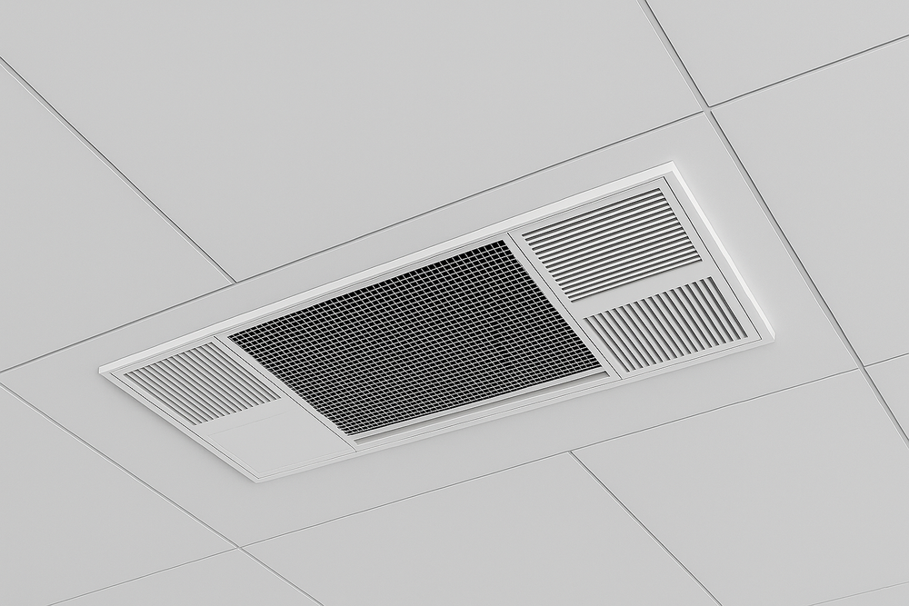 The air vent provides dilution control of gaseous contaminants. Activated carbon post-filtration adsorbs odors and gases to further freshen the air. The attractive grille fits flush with the ceiling and is completely inconspicuous. The cabinet is hidden in the unused space above the drop ceiling tile.
