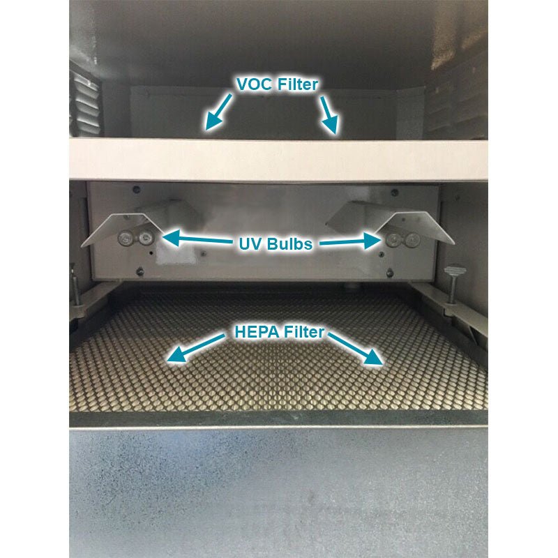 - Each unit comes fully equipped with 1 VOC cartridge, 2 UV lamps, and 1 HEPA filter